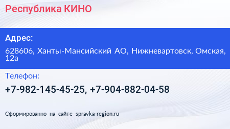 Республика КИНО по адресу 628606, Ханты-Мансийский АО, Нижневартовск, Омская, 12а в дальнейшем Организация, размещена в следующих категориях:
