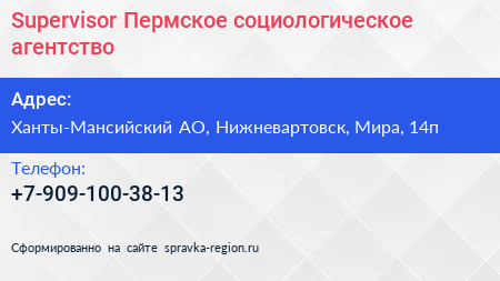 Supervisor, Пермское социологическое агентство по адресу Ханты-Мансийский АО, Нижневартовск, Мира, 14п в дальнейшем Организация, размещена в следующих категориях: