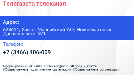 Телегазета, телеканал по адресу 628611, Ханты-Мансийский АО, Нижневартовск, Дзержинского, 9/1 в дальнейшем Организация, размещена в следующих категориях: