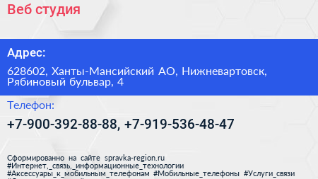 Веб-студия по адресу 628602, Ханты-Мансийский АО, Нижневартовск, Рябиновый бульвар, 4 в дальнейшем Организация, размещена в следующих категориях: