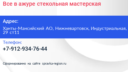 Все в ажуре, стекольная мастерская по адресу Ханты-Мансийский АО, Нижневартовск, Индустриальная, 29 ст11 в дальнейшем Организация, размещена в следующих категориях: