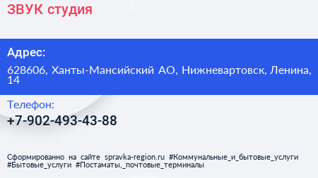 ЗВУК, студия по адресу 628606, Ханты-Мансийский АО, Нижневартовск, Ленина, 14 в дальнейшем Организация, размещена в следующих категориях: