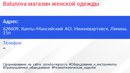 Balunova, магазин женской одежды по адресу 628609, Ханты-Мансийский АО, Нижневартовск, Ленина, 15п в дальнейшем Организация, размещена в следующих категориях: