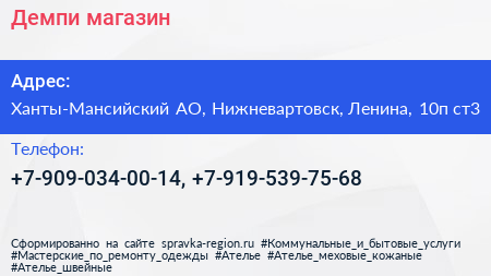 Демпи, магазин по адресу Ханты-Мансийский АО, Нижневартовск, Ленина, 10п ст3 в дальнейшем Организация, размещена в следующих категориях: