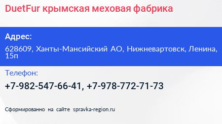 DuetFur, крымская меховая фабрика по адресу 628609, Ханты-Мансийский АО, Нижневартовск, Ленина, 15п в дальнейшем Организация, размещена в следующих категориях: