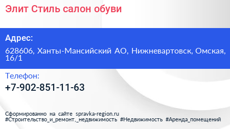 Элит Стиль, салон обуви по адресу 628606, Ханты-Мансийский АО, Нижневартовск, Омская, 16/1 в дальнейшем Организация, размещена в следующих категориях:
