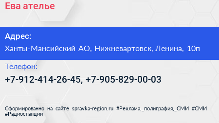 Ева, ателье по адресу Ханты-Мансийский АО, Нижневартовск, Ленина, 10п в дальнейшем Организация, размещена в следующих категориях: