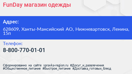 FunDay, магазин одежды по адресу 628609, Ханты-Мансийский АО, Нижневартовск, Ленина, 15п в дальнейшем Организация, размещена в следующих категориях: