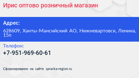 Ирис, оптово-розничный магазин по адресу 628609, Ханты-Мансийский АО, Нижневартовск, Ленина, 15п в дальнейшем Организация, размещена в следующих категориях: