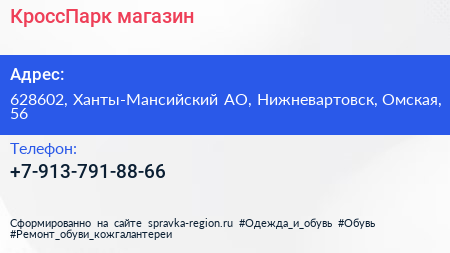 КроссПарк, магазин по адресу 628602, Ханты-Мансийский АО, Нижневартовск, Омская, 56 в дальнейшем Организация, размещена в следующих категориях: