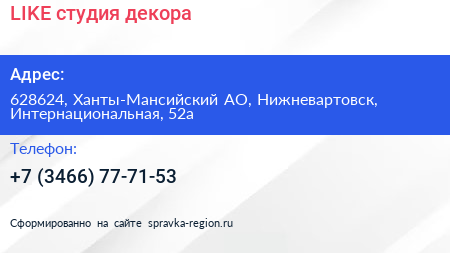 LIKE, студия декора по адресу 628624, Ханты-Мансийский АО, Нижневартовск, Интернациональная, 52а в дальнейшем Организация, размещена в следующих категориях: