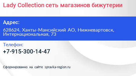 Lady Collection, сеть магазинов бижутерии по адресу 628624, Ханты-Мансийский АО, Нижневартовск, Интернациональная, 73 в дальнейшем Организация, размещена в следующих категориях: