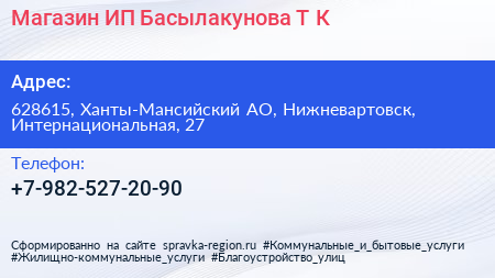 Магазин, ИП Басылакунова Т.К. по адресу 628615, Ханты-Мансийский АО, Нижневартовск, Интернациональная, 27 в дальнейшем Организация, размещена в следующих категориях: