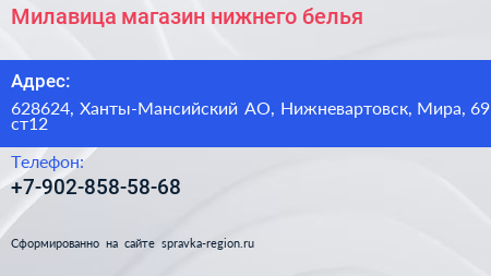 Милавица, магазин нижнего белья по адресу 628624, Ханты-Мансийский АО, Нижневартовск, Мира, 69 ст12 в дальнейшем Организация, размещена в следующих категориях: