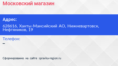 Московский, магазин по адресу 628616, Ханты-Мансийский АО, Нижневартовск, Нефтяников, 19 в дальнейшем Организация, размещена в следующих категориях: