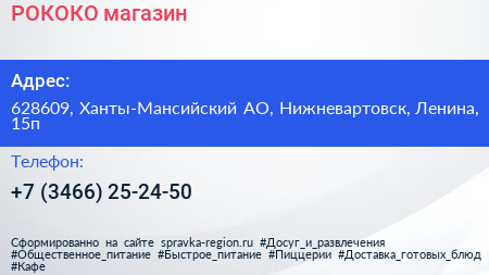 РОКОКО, магазин по адресу 628609, Ханты-Мансийский АО, Нижневартовск, Ленина, 15п в дальнейшем Организация, размещена в следующих категориях: