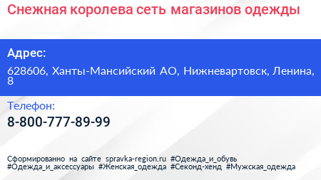 Снежная королева, сеть магазинов одежды по адресу 628606, Ханты-Мансийский АО, Нижневартовск, Ленина, 8 в дальнейшем Организация, размещена в следующих категориях: