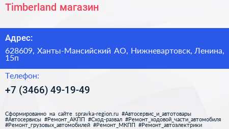 Timberland, магазин по адресу 628609, Ханты-Мансийский АО, Нижневартовск, Ленина, 15п в дальнейшем Организация, размещена в следующих категориях: