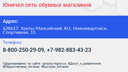 Юничел, сеть обувных магазинов по адресу 628617, Ханты-Мансийский АО, Нижневартовск, Спортивная, 15 в дальнейшем Организация, размещена в следующих категориях:
