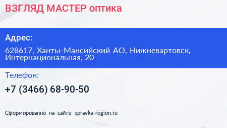 ВЗГЛЯД-МАСТЕР, оптика по адресу 628617, Ханты-Мансийский АО, Нижневартовск, Интернациональная, 20 в дальнейшем Организация, размещена в следующих категориях: