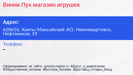 Винни-Пух, магазин игрушек по адресу 628616, Ханты-Мансийский АО, Нижневартовск, Нефтяников, 19 в дальнейшем Организация, размещена в следующих категориях: