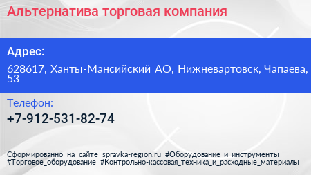 Альтернатива, торговая компания по адресу 628617, Ханты-Мансийский АО, Нижневартовск, Чапаева, 53 в дальнейшем Организация, размещена в следующих категориях: