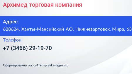 Архимед, торговая компания по адресу 628624, Ханты-Мансийский АО, Нижневартовск, Мира, 63 в дальнейшем Организация, размещена в следующих категориях: