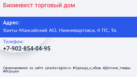 Биоинвест, торговый дом по адресу Ханты-Мансийский АО, Нижневартовск, 4 ПС, 9а в дальнейшем Организация, размещена в следующих категориях: