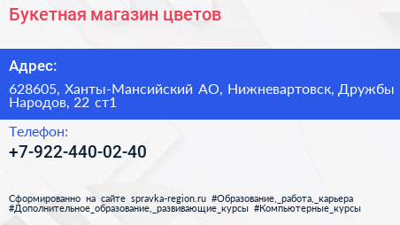 Букетная, магазин цветов по адресу 628605, Ханты-Мансийский АО, Нижневартовск, Дружбы Народов, 22 ст1 в дальнейшем Организация, размещена в следующих категориях: