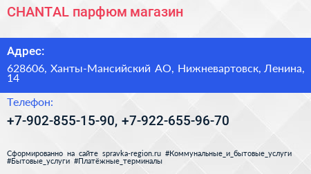 CHANTAL-парфюм, магазин по адресу 628606, Ханты-Мансийский АО, Нижневартовск, Ленина, 14 в дальнейшем Организация, размещена в следующих категориях: