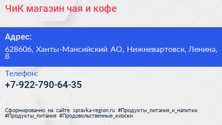 ЧиК, магазин чая и кофе по адресу 628606, Ханты-Мансийский АО, Нижневартовск, Ленина, 8 в дальнейшем Организация, размещена в следующих категориях: