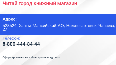 Читай-город, книжный магазин по адресу 628624, Ханты-Мансийский АО, Нижневартовск, Чапаева, 27 в дальнейшем Организация, размещена в следующих категориях: