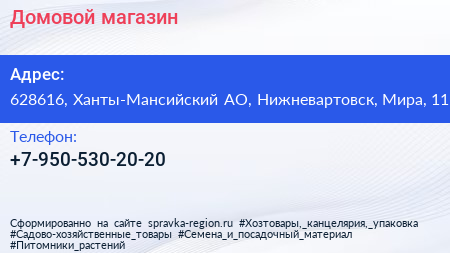 Домовой, магазин по адресу 628616, Ханты-Мансийский АО, Нижневартовск, Мира, 11 в дальнейшем Организация, размещена в следующих категориях: