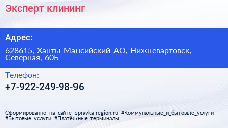 Эксперт-клининг по адресу 628615, Ханты-Мансийский АО, Нижневартовск, Северная, 60Б в дальнейшем Организация, размещена в следующих категориях: