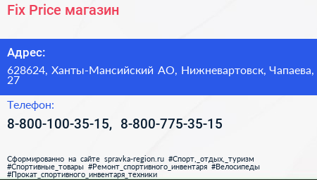 Fix-Price, магазин по адресу 628624, Ханты-Мансийский АО, Нижневартовск, Чапаева, 27 в дальнейшем Организация, размещена в следующих категориях: