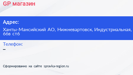 GP, магазин по адресу Ханты-Мансийский АО, Нижневартовск, Индустриальная, 66в ст6 в дальнейшем Организация, размещена в следующих категориях:
