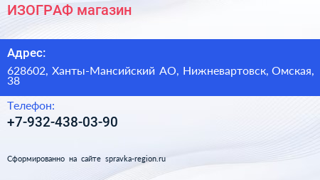 ИЗОГРАФ, магазин по адресу 628602, Ханты-Мансийский АО, Нижневартовск, Омская, 38 в дальнейшем Организация, размещена в следующих категориях: