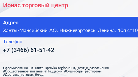 Ионас, торговый центр по адресу Ханты-Мансийский АО, Нижневартовск, Ленина, 10п ст10 в дальнейшем Организация, размещена в следующих категориях: