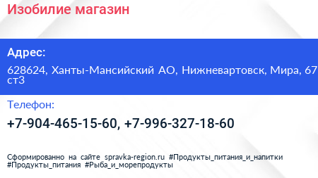 Изобилие, магазин по адресу 628624, Ханты-Мансийский АО, Нижневартовск, Мира, 67 ст3 в дальнейшем Организация, размещена в следующих категориях: