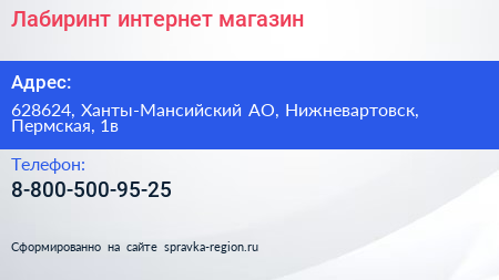 Лабиринт, интернет-магазин по адресу 628624, Ханты-Мансийский АО, Нижневартовск, Пермская, 1в в дальнейшем Организация, размещена в следующих категориях:
