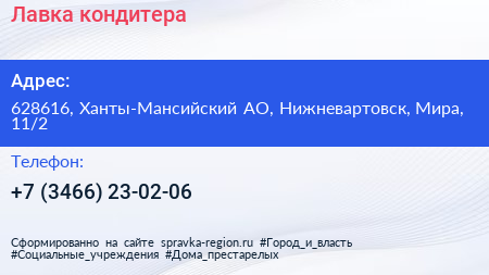 Лавка кондитера по адресу 628616, Ханты-Мансийский АО, Нижневартовск, Мира, 11/2 в дальнейшем Организация, размещена в следующих категориях: