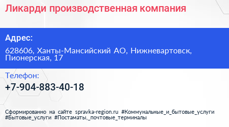 Ликарди, производственная компания по адресу 628606, Ханты-Мансийский АО, Нижневартовск, Пионерская, 17 в дальнейшем Организация, размещена в следующих категориях: