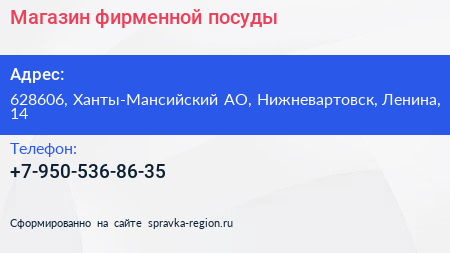 Магазин фирменной посуды по адресу 628606, Ханты-Мансийский АО, Нижневартовск, Ленина, 14 в дальнейшем Организация, размещена в следующих категориях: