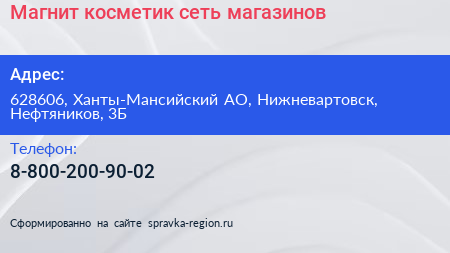 Магнит косметик, сеть магазинов по адресу 628606, Ханты-Мансийский АО, Нижневартовск, Нефтяников, 3Б в дальнейшем Организация, размещена в следующих категориях: