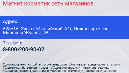 Магнит косметик, сеть магазинов по адресу 628616, Ханты-Мансийский АО, Нижневартовск, Маршала Жукова, 26 в дальнейшем Организация, размещена в следующих категориях: