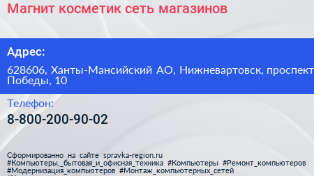 Магнит косметик, сеть магазинов по адресу 628606, Ханты-Мансийский АО, Нижневартовск, проспект Победы, 10 в дальнейшем Организация, размещена в следующих категориях: