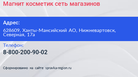 Магнит косметик, сеть магазинов по адресу 628609, Ханты-Мансийский АО, Нижневартовск, Северная, 17а в дальнейшем Организация, размещена в следующих категориях: