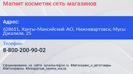 Магнит косметик, сеть магазинов по адресу 628611, Ханты-Мансийский АО, Нижневартовск, Мусы Джалиля, 25 в дальнейшем Организация, размещена в следующих категориях: