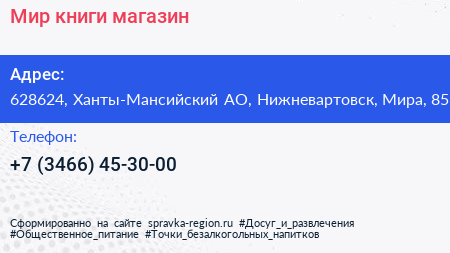Мир книги, магазин по адресу 628624, Ханты-Мансийский АО, Нижневартовск, Мира, 85 в дальнейшем Организация, размещена в следующих категориях: