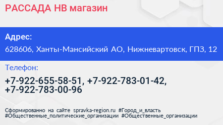 РАССАДА-НВ, магазин по адресу 628606, Ханты-Мансийский АО, Нижневартовск, ГПЗ, 12 в дальнейшем Организация, размещена в следующих категориях: